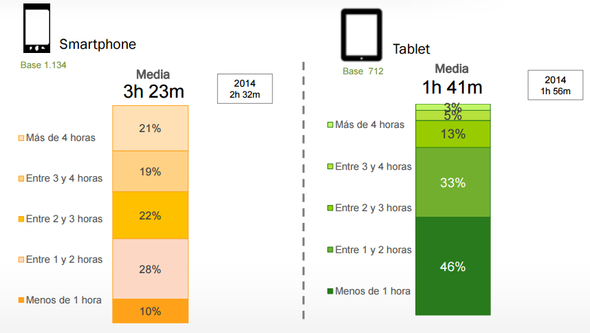 5. Los españoles estamos conectados 3,23 horas al día a nuestro smartphone, 51 minutos más que en 2014. El uso de navegación en tablet retrocede 14 minutos: 1,41 horas de media al día en 2015, frente las 1,56 horas de un año antes.