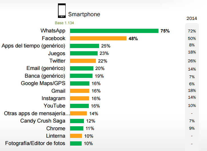 10. WhatsApp, presente en el 75% de los móviles, y Facebook, en el 48%, son las apps preferidas por los españoles.