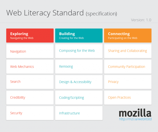 Esta rama del estándar de Mozilla de alfabetización web incluye cinco competencias, cada una con una serie de habilidades.