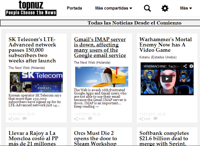 En cambio, Topnuz revisa las noticias de una gran cantidad de medios de comunicación, para luego publicar en su sitio web aquellas que tienen más repercusión en Facebook, Twitter, Google+ y LinkedIn (fuimos los primeros en determinar la popularidad de los enlaces en función de su repercusión social en Internet). Pero no basta con que alguien haga clic en el enlace de una noticia, tiene además que compartirla para así demostrar que realmente le interesa. Por otra parte, Topnuz funciona en inglés y español, tiene ediciones dedicadas a ocho países diferentes y las noticias que publica se eligen automáticamente, no de forma subjetiva o discrecional.