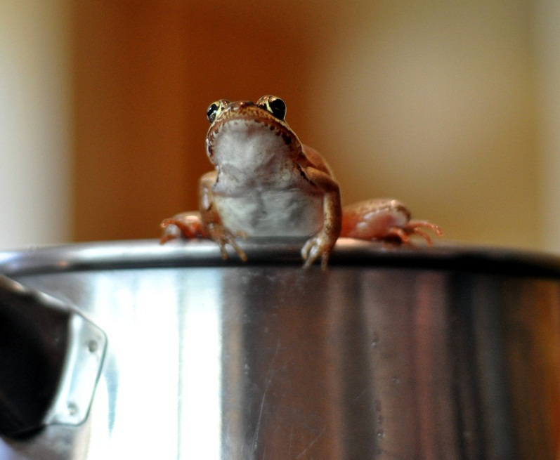 Si metemos una rana en una cazuela de agua hirviendo, inmediatamente intenta salir. Pero si introducimos la rana en agua a temperatura ambiente, se queda tranquila. Cuando la temperatura del agua se eleva de 21 a 26 grados centígrados, la rana no hace nada e incluso parece estar a gusto. Pero si la temperatura del agua sigue subiendo, nuestra rana estará cada vez más aturdida y no estará en condiciones de salir de la cazuela, aunque realmente no hay nada que se lo impida. Finalmente, la rana se queda allí y acaba cocida.