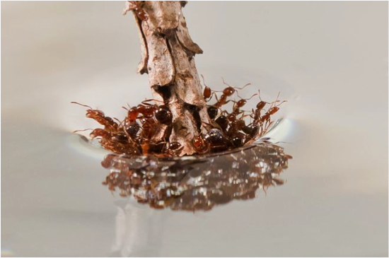 Investigadores del Instituto de Tecnología de Georgia (EE.UU.) han descubierto que las hormigas de fuego (Solenopsis invicta) crean una especie de balsa resistente al agua cuando hay inundaciones para salvar a la colonia. Para comprobar cómo estos insectos reaccionan ante una emergencia, el equipo dirigido por David Hu arrojó entre 500 y 800 hormigas al agua. Observaron que se agrupaban con rapidez, agarrándose unas a otras con sus mandíbulas y pinzas para formar la estructura. Retirando poco a poco las hormigas de la parte superior comprobaron que las del fondo se movían para conservar el grosor de la estructura mediante una conducta cooperativa que lograba su supervivencia.