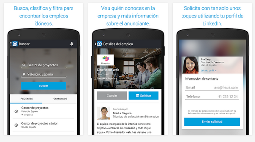 Desde la misma app, podemos optar por ofertas donde soliciten un perfil de Linkedin similar al nuestro, puesto que su tecnología cruza los datos entre empresas y candidatos. Las búsquedas se realizan por título, ubicación y palabras clave.