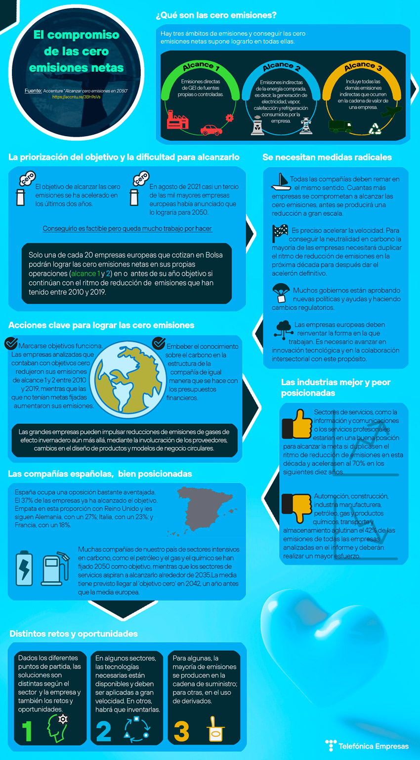 Cero emisiones: una hoja de ruta insoslayableMercedes Núñez 26 noviembre, 2021 Los expertos coinciden en que el cambio climático ya es la mayor amenaza a la que se enfrenta el planeta en los próximos años. De ahí que se hable de las cero emisiones como un mantra. Pero ¿qué es exactamente y qué alcance tiene? El objetivo de lograr esas cero emisiones se ha acelerado en los últimos dos años. Las empresas europeas, sobre todo, están más comprometidas que nunca. En este sentido, es interesante este artículo tras la cumbre COP26 sobre el clima de Glasgow, que habla del liderazgo de la UE en la transición energética hacia un mundo sin carbono. Más avanzada en su transición energética que la mayoría, puede predicar con el ejemplo -se dice-, compartir y comercializar sus experiencias. Pero ¿en qué momento se lograrán las cero emisiones: 2025, 2042, 2050? Conseguirlo es factible pero lo cierto es que queda mucho trabajo por hacer. Hay países e industrias mejor y peor posicionados y es necesario combinar medidas de diversa índole. Las TIC y la innovación también constituyen una herramienta clave. En algunos sectores, las tecnologías necesarias ya están disponibles, pero no así en otros. Hay retos y oportunidades asociados en esta hoja de ruta insoslayable. Todo esto se aborda en el informe de Accenture «Alcanzar cero emisiones en 2050», del que hemos hecho un extracto en la infografía inferior. España, posición aventajada en Europa Respecto a las cero emisiones, España ocupa una posición aventajada dentro de Europa. El 37 por ciento de nuestras empresas ya ha alcanzado el objetivo, por delante de Alemania, Italia y Francia. Y en general tienen previsto llegar al ‘objetivo cero’ en 2042, un año antes que la media europea, según recoge el estudio de la consultora. Telefónica es un buen ejemplo de este compromiso por construir un futuro digital y más verde. Recientemente se convertía en la telco líder en compromiso con el planeta, al obtener la mejor puntuación en la dimensión ambiental del S&P-Dow Jones Sustainability Index (DJSI) 2021. Infografía: Fernando Rodríguez Cabello Imagen: Alexander Steinhof Realidad virtual o machine learning contra la violencia de género“Nunca se llega a ninguna meta sin entusiasmo, es un estímulo para el éxito”