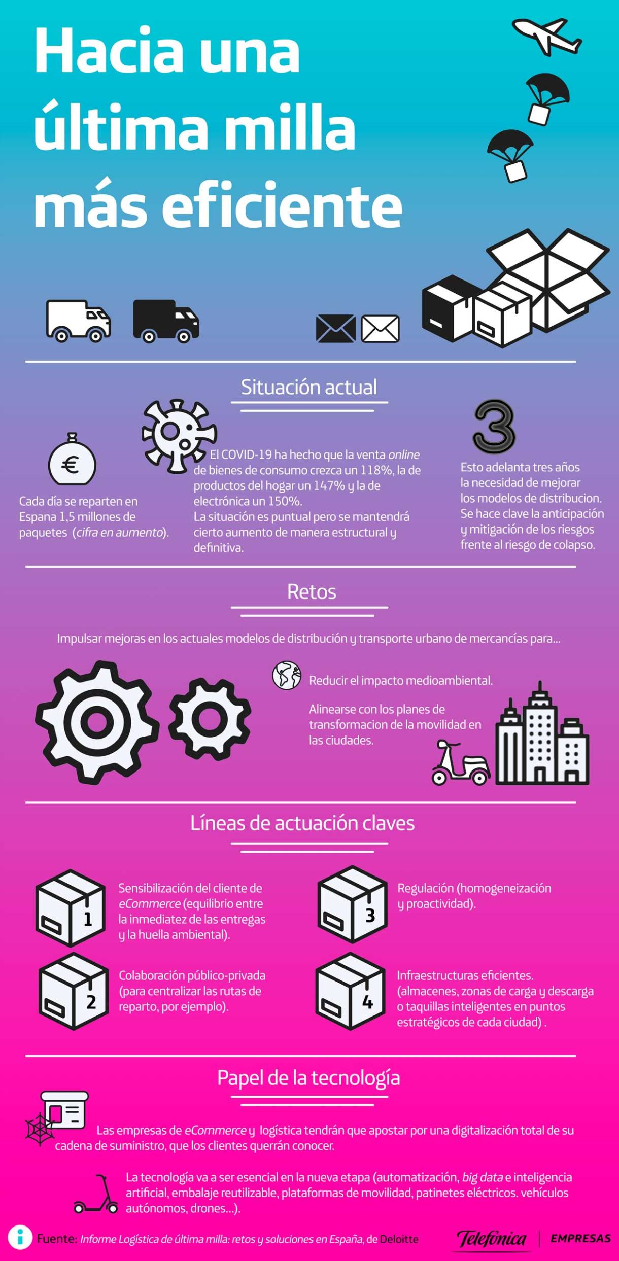 Logística inteligente y una última milla más eficienteMercedes Núñez 27 noviembre, 2020 Son fechas complicadas para la logística. El maratón del Black Friday, el Ciber Monday, la campaña navideña y así hasta las rebajas de enero. Se me viene a la cabeza el post que publicábamos a principios de año, cuando el COVID-19 aún no había irrumpido en nuestra vidas, sobre las diez tendencias TIC que marcarían 2020, en el que ya se mencionaba la creación de un sector de la última milla, La logística inteligente se hace indispensable. El crecimiento de las compras online que se está produciendo hace que también la logística viva un boom. Cada vez hay mayor volumen de repartos, se demandan nuevos perfiles laborales, emerge un ecosistema de emprendimiento e innovación a su alrededor y atrae el interés de los inversores y el sector inmobiliario. What else?, qué diría George Clooney… Pero también se enfrenta a grandes retos, como veremos a continuación. Y la digitalización y la sostenibilidad, una vez más, forman parte de la solución. Este año, debido a la pandemia, se esperaba un récord en la campaña del “viernes negro” con hasta 50 millones de envíos en España, 5 de ellos solo el lunes posterior, según la patronal UNO Logística. “Puede reventar las costuras del comercio online”, se publicaba hace unos días. Por las circunstancias actuales es más fácil que nos encontremos en casa pero pensemos, además, en los intentos de segundas y terceras entregas… Y a ello hay que sumar que luego las devoluciones podrían alcanzar el 30% de las ventas según un estudio de SalesForce. En resumen, un no parar de paquetes en tránsito. El impulso del COVID-19 al eCommerce y una logística inteligente En realidad desde marzo, cuando se decretó el confinamiento, el sector vive en un pico. Durante esos primeros meses el volumen del eCommerce llegó a multiplicarse por tres y en el primer semestre del año el porcentaje de compradores online de gran consumo se ha incrementado 12 puntos, según AECOC. Buena parte de este crecimiento será estructural porque se prevé que el comercio electrónico siga creciendo. Y deberá ir acompañado de una logística inteligente. La nueva normalidad, cada vez más omnicanal Los retailers están apostado de manera más decidida que nunca por la transformación de sus modelos de negocio – hasta las tiendas de barrio han entendido que deben estar en Internet. Y la aceleración de la digitalizacion junto a los nuevos hábitos de los consumidores por las restricciones de aforo y horarios en las tiendas y la prudencia apuntan a un mayor volumen de compras en plataformas digitales. El valor estratégico de la logística y los retos por delante El eslabón débil de la cadena es una mayor presión sobre almacenes, centros de logística y empresas de reparto. Como apuntábamos hace ya seis años, el eCommerce se juega la credibilidad con la logística. Una última milla más eficiente Las exigencias son muy altas y el cumplimiento complicado: todos queremos recibir nuestros pedidos lo antes posible, en la franja horaria acordada, en el sitio elegido. El tiempo de espera aceptable es de tres días pero el 50 por ciento lo quiere en un máximo de dos días y el 15 por ciento solo da un margen de 24 horas. ¡Pensemos que Amazon ha estrenado flota de aviones propia para realizar las entregas en el menor tiempo! Eficiencia operativa, automatización, una logística predictiva… La buena noticia es que hay un gran potencial de crecimiento y mejora para adaptarse a las crecientes necesidades del eCommerce. Aspectos como la visibilidad de la cadena de suministro, la eficiencia operativa con la automatización de procesos o predicciones más exactas son clave. Buena parte del sector ya tiene en marcha proyectos de logística inteligente, con ayuda de tecnologías como IoT, big data, inteligencia artificial o marchine learning. 5G en la central logística de El Corte Inglés en Valdemoro La logística es, además, uno de las verticales de Industria 4.0 que más se puede beneficiar de la nueva generación de comunicaciones móviles. 5G creará nuevas oportunidades para el sector logístico también. Un ejemplo es la red 5G privada que Telefónica Empresas, en colaboración con Ericsson ha desplegado en la central logística de Valdemoro de El Corte Inglés para optimizar los procesos de paquetería y clasificación. Soluciones innovadoras en aras de la sostenibilidad El respeto al medioambiente es una obligación inexcusable, las ciudades no pueden colapsarse más. Según un informe de Deloitte, del que extraemos las claves para una última milla más eficiente en la infografía inferior, el 25 por ciento de las emisiones totales de gases contaminantes en España proceden del transporte de mercancías. El actual modelo de distribución supone un coste económico anual de entre 15.000 y 24.000 millones de euros, lo que representa el 2 por ciento del PIB nacional, según AECOC. El cálculo es resultado de la suma del impacto que genera esta movilidad en el medioambiente, el tiempo que pierden los usuarios en los atascos, así como de la siniestralidad urbana, una de las más altas de Europa. Aunque hace ya tiempo que en logística se barajan soluciones innovadoras en este momento, como ocurre con todo, urgen más que nunca. Puntos de abastecimiento más cerca de los núcleos de población, mini hubs en el centro de las ciudades, dark stores (puntos de venta que atienden exclusivamente las compras en línea) y el uso de taquillas, comercios de proximidad o la propia red de tiendas físicas de la marca para la recogida de pedidos son algunas de ellas. También se abre la puerta a fórmulas como las entregas agrupadas e incluso que el repartidor espere quince minutos a que el cliente se pruebe la prenda y así ahorrar un viaje en caso de devolución, como se ensaya en Alemania. No son tiempos de certidumbres pero está claro que la logística va a estar c