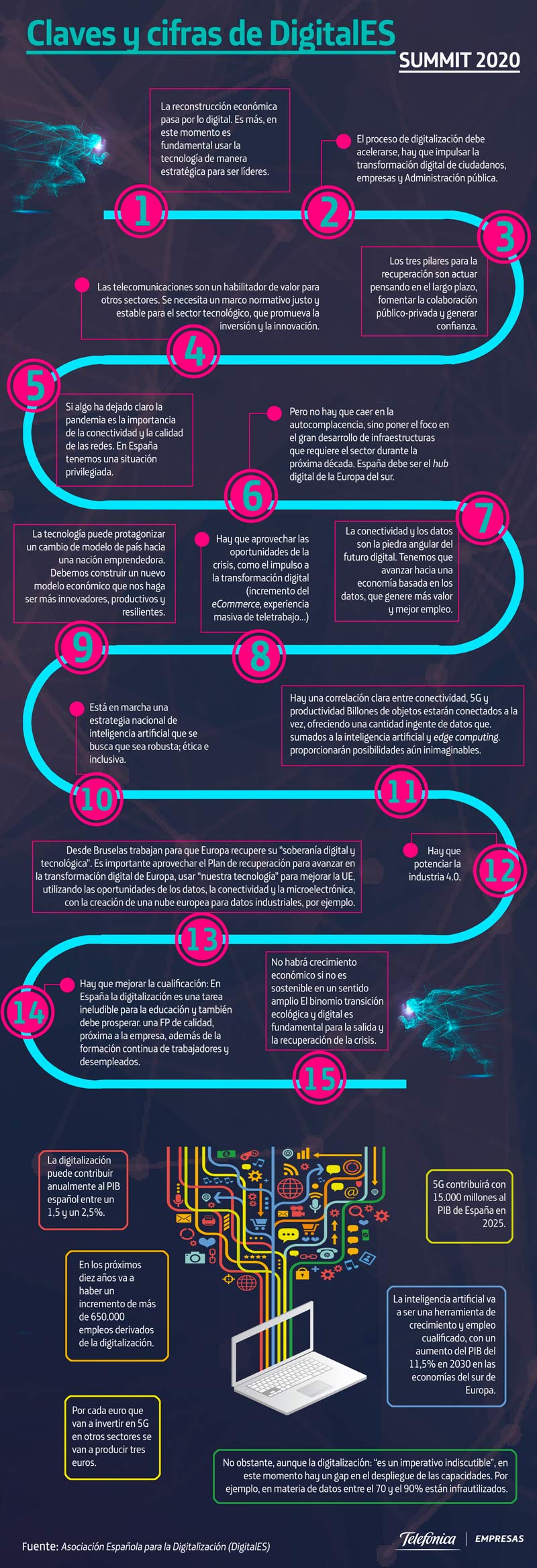 Quince claves y algunas cifras de DigitalES Summit 2020Equipo Editorial 1 octubre, 2020 Hace unas semanas escribíamos de la tercera edición de “DigitalES Summit 2020”, que se celebró entre los pasados días 8 y 10 de septiembre. Hoy volvemos de nuevo a este encuentro por la importancia de lo que allí se dijo en este momento. Llamamos, para ello, la atención de manera más visual con una infografía sobre quince claves y algunas cifras de DigitalES. Todos los puntos son de máximo interés. Los hemos abordado a lo largo del tiempo en este blog. Por ejemplo, la conectividad como piedra angular. También la importancia del binomio transición ecológica y transformación digital para la salida y recuperación de la crisis. O el valor de los casos de uso de 5G y sus posibilidades aún inimaginables. Y siempre las personas en el centro y la importancia de una mayor capacitación digital. ¡No os la perdáis, es hora de liderar el cambio!: Infografía: Manuel Carballo y Fernando Rodríguez Tracking media o cómo la visión artificial optimiza procesosUn hito para la historia del voluntariado digital: #DIVT 2020