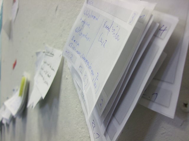 - Tablero: pizarra con carriles donde se refleja el trabajo que se está haciendo en el sprint. Al menos debe haber tres carriles -trabajo pendiente, en progreso y hecho- y sirve para tener una imagen de lo que está haciendo cada persona del equipo así como del avance del trabajo en el sprint actual.