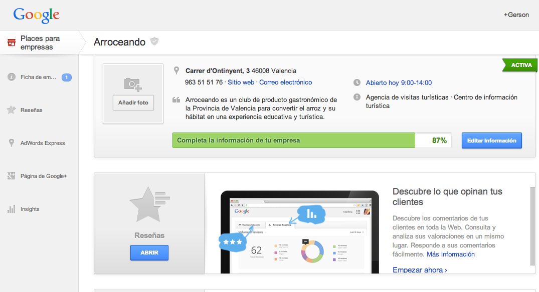 - Página de Google+: “Esta ficha de empresa y tu página de Google+ están vinculadas. Accede a tu página para responder a las reseñas y compartir novedades con tus clientes”. Este es uno de los aspectos más importantes, ya que Google confirma el proceso de integrar sus páginas con los lugares, que son gestionados por el administrador, tal y como ocurre en los negocios offline.