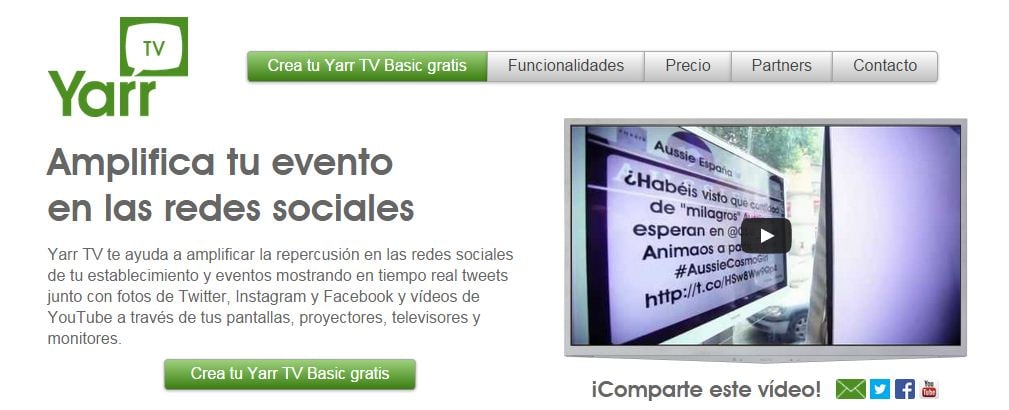 Yarr.tv sigue un modelo Freemium. Para probar esta versión gratuita, sólo debemos pinchar en la opción “Crea tu Yarr TV Basic gratis”, que encontraremos en la página de inicio yarr.tv. Al pinchar aquí, automáticamente se desplaza a la parte inferior de la página, donde encontramos el formulario que debemos rellenar para poder disfrutar de la monitorización de los mensajes en nuestro evento. No es necesario el registro como tal, aunque es obligatorio ceder una dirección de correo electrónico y, por lo menos, un hashtag o una cuenta de Twitter para poder obtener resultados para mostrar.